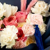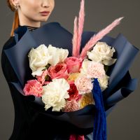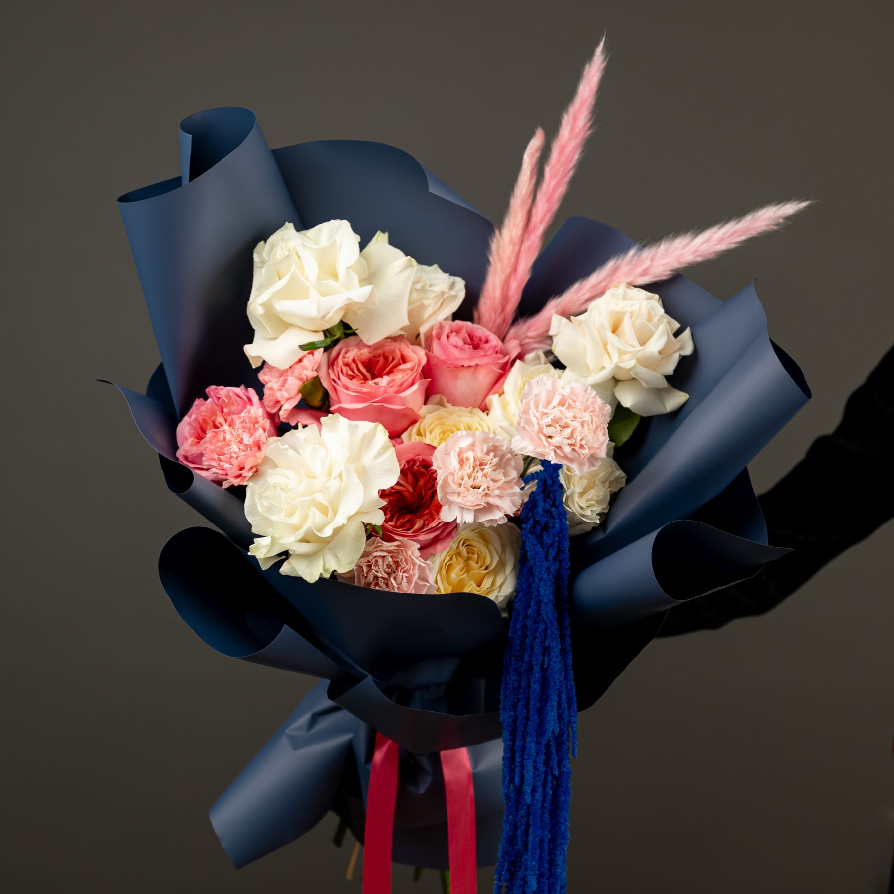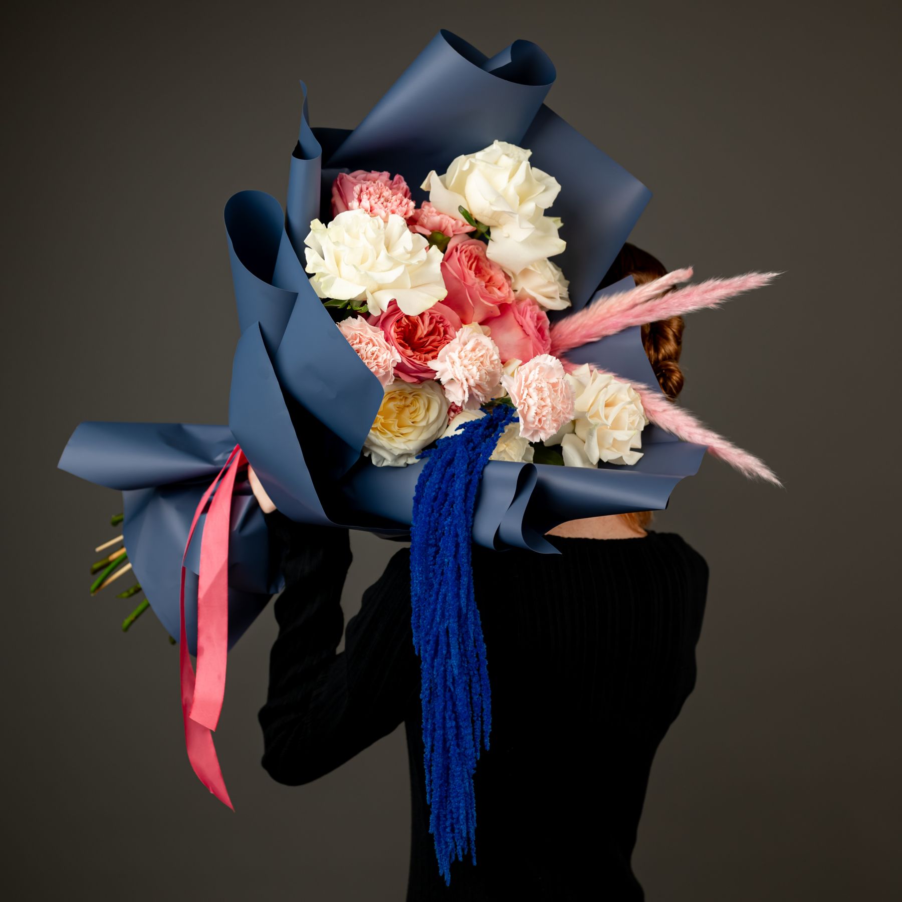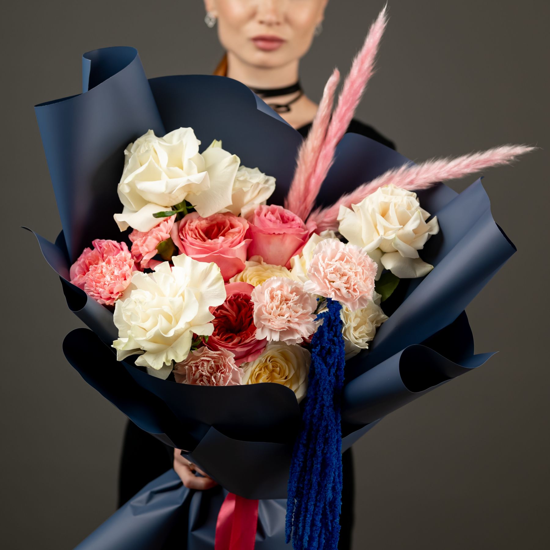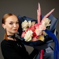 Состав: 3 французские розы, 2 мондиаль розы, 3 розы Кендел Лайт, 5 роз пинк экспрешн, 5 диантусов, 3 сухоцвета, 1 амарант стабилизированный